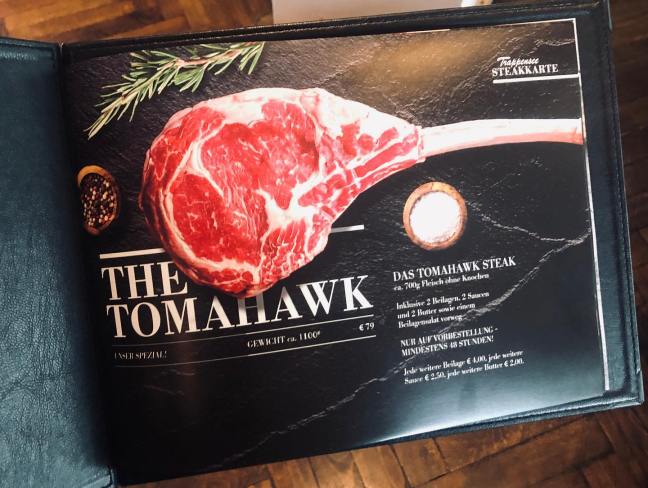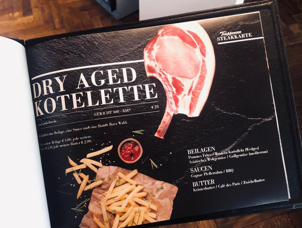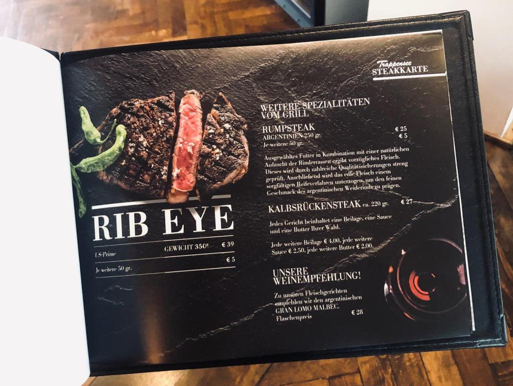 Steakkarte für’s Trappensee Restaurant, Heilbronn.